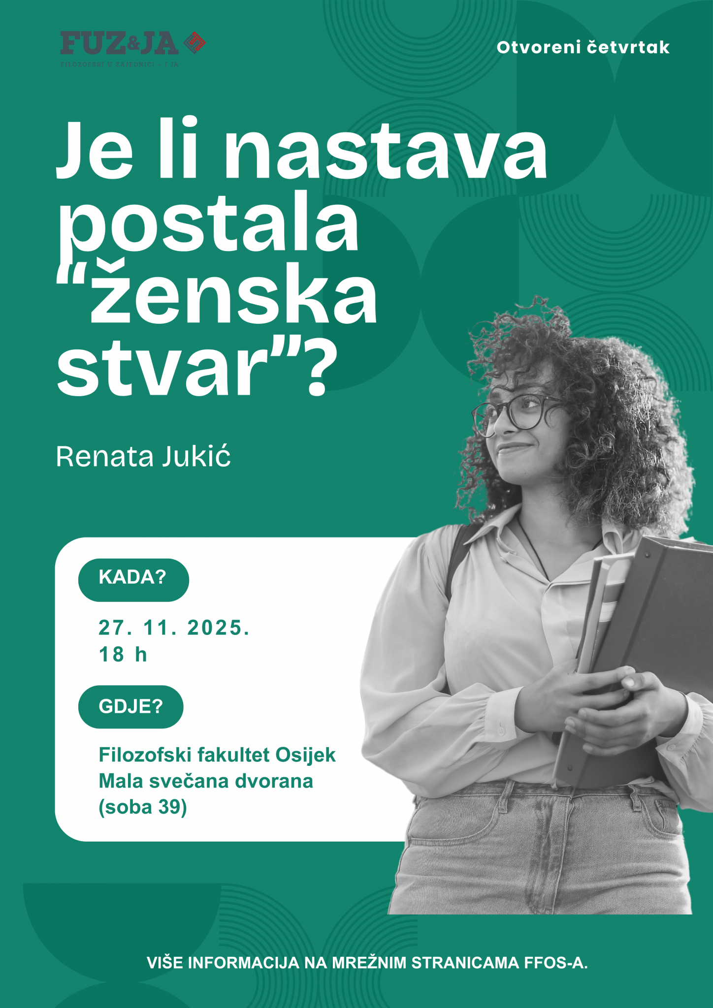 U četvrtak, 27. studenog 2025. održat će se drugo popularno-znanstveno događanje u sklopu 14. ciklusa Otvorenog četvrtka kao dijela projekta popularizacije znanosti FUZ&JA Filozofskog fakulteta u Osijeku, naslovljeno Je li nastava postala „ženska stvar”?, koje će održati prof. dr. sc. Renata Jukić s Odsjeka za pedagogiju Filozofskog fakulteta Sveučilišta J. J. Strossmayera u Osijeku.