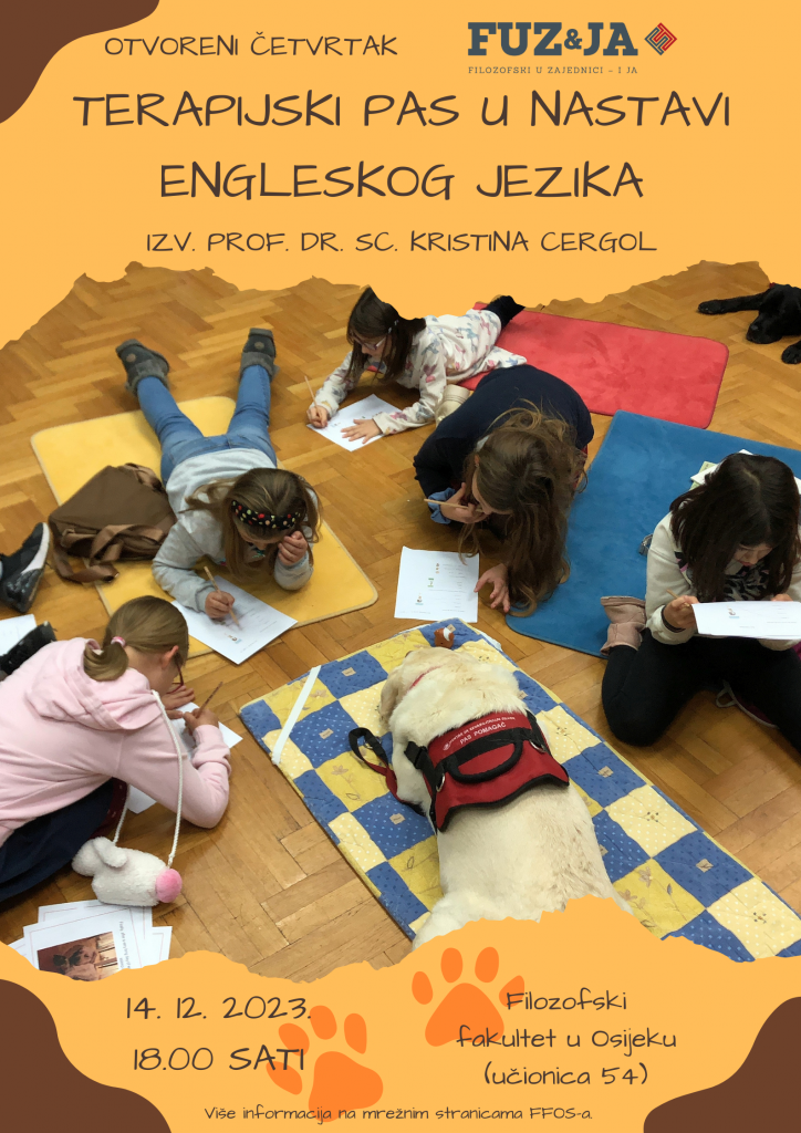 U četvrtak, 14. prosinca 2023., održat će se treće popularno-znanstveno događanje u sklopu 12. ciklusa Otvorenog četvrtka kao dijela projekta popularizacije znanosti FUZ&JA Filozofskog fakulteta u Osijeku, naslovljeno Terapijski pas u nastavi engleskog jezika, koje će održati izv. prof. dr. sc. Kristina Cergol s Učiteljskog fakulteta Sveučilišta u Zagrebu.