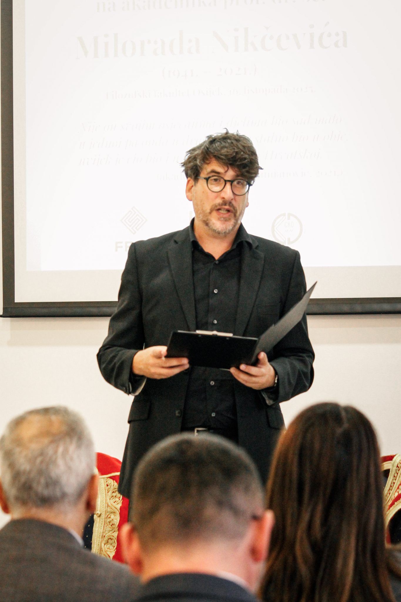 V. d. pročelnika našega odsjeka doc. dr. sc. Vera Blažević Krezić podsjetila je na Nikčevićev angažman u okviru Odsjeka za hrvatski jezik i književnost gdje je predavao kolegije Metodika jezika i književnosti, Metodologija znanstvenog rada i Metodika nastave književnosti.