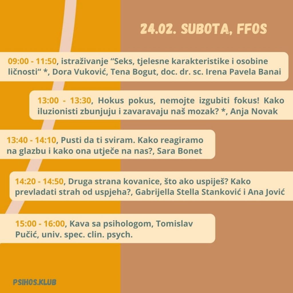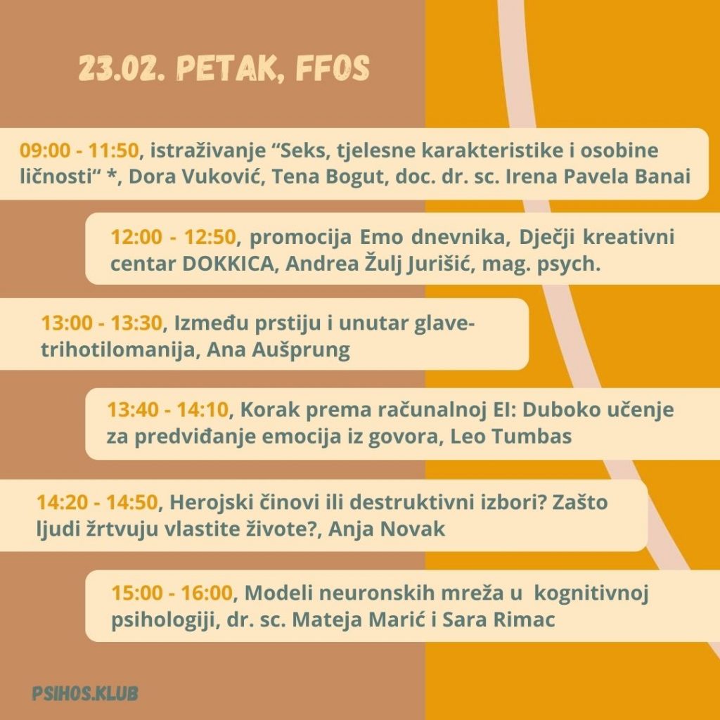 Pozivamo sve zainteresirane na događanja 17. Tjedna psihologije, koja će se održavati 23. i 24. veljače 2024. prema objavljenom rasporedu na Filozofskom fakultetu u Osijeku.