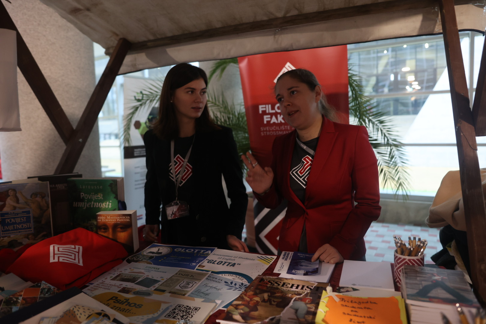 Kako je istaknula predsjednica Studentskog zbora FFOS-a Leonarda Nago, izložbeni štand FFOS-a bio je jedan od najdetaljnije organiziranih na Sveučilišnoj smotri. Prikazao je raznolikost sadržaja studijskih programa: monografije profesora s različitih odsjeka, promo materijale studentskih udruga i web shopa fakulteta uz primjerke studentskih časopisa te je izdvojen prostor za novi studijski smjer Povijest umjetnosti, koji je jedan od primjera novih mogućnosti studiranja na FFOS-u. Leonarda je istaknula prednost velike raznolikosti studijskih programa na FFOS-u, gdje svatko može pronaći nešto za sebe. Uz prijateljsku i obiteljsku atmosferu, kao još neke od prednosti navodi karakter pet-friendly ustanove te stručnost profesora i predavača. Dodaje kako studijske grupe nisu prevelike, što olakšava mogućnost povezivanja i upoznavanja s kolegama.
