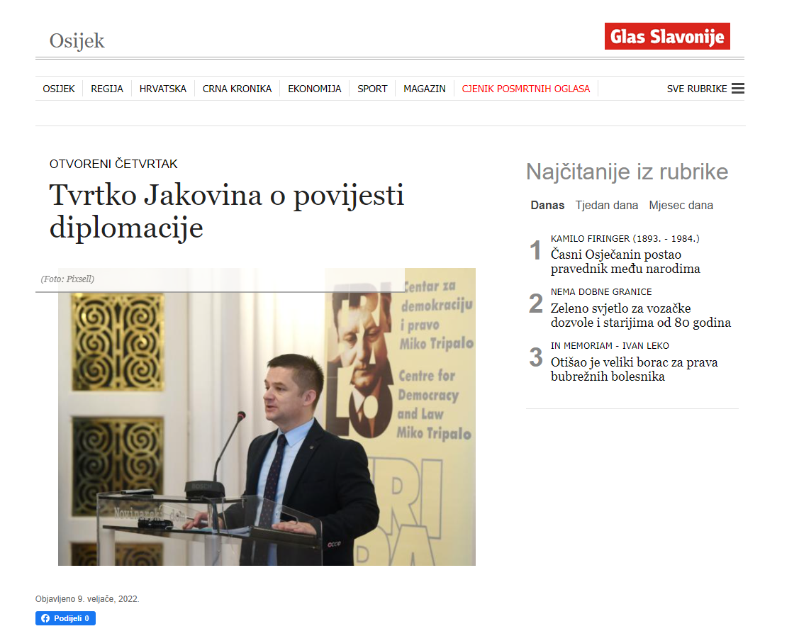 Glas Slavonije: Tvrtko Jakovina o povijesti diplomacije Objavljeno 9. veljače 2022. | Administrator https://www.glas-slavonije.hr/485810/3/Tvrtko-Jakovina-o-povijesti-diplomacije https://www.glas-slavonije.hr/486322/3/O-povijesti-jugoslavenske-diplomacije