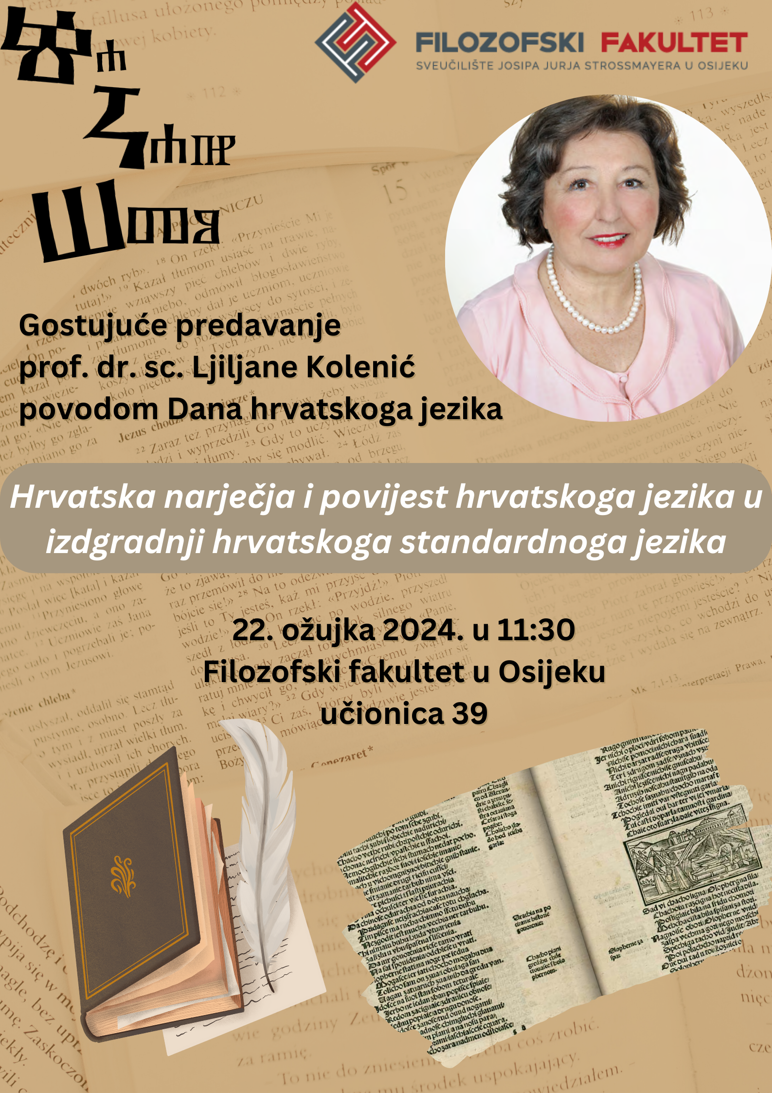 Prof. dr. sc. Ljiljana Kolenić održat će gostujuće predavanje povodom Dana hrvatskoga jezika pod nazivom Hrvatska narječja i povijest hrvatskoga jezika u izgradnji hrvatskoga standardnoga jezika. Predavanje će se održati 22. ožujka 2024. u 11:30 u učionici 39.