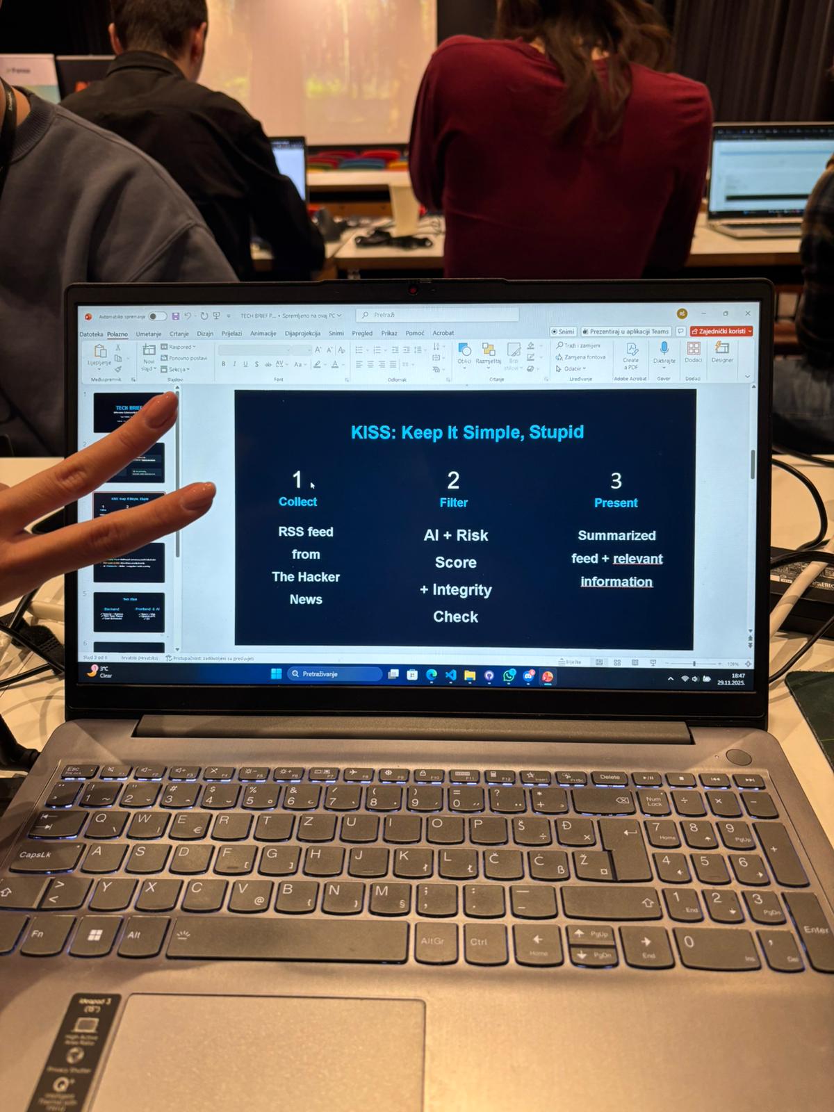 SheepAI hackathon, održan u organizaciji tvrtke Fonoa i partnera, okupio je timove iz cijele Hrvatske s ciljem razvoja rješenja koja bi automatski prikupljala, filtrirala, sažimala i prikazivala vijesti s portala The Hacker News. Zadatak je bio osmisliti sustav koji korisnicima omogućuje brzu orijentaciju u kibernetičkoj sigurnosti, uz naglasak na pouzdanost izvora, personalizaciju sadržaja, zaštitu od dezinformacija i izbjegavanje halucinacija velikih jezičnih modela. Natjecatelji su tijekom cijelog dana radili u kratkim iteracijama, uz stalnu komunikaciju s mentorima i prilagodbu rješenja prema njihovim savjetima.