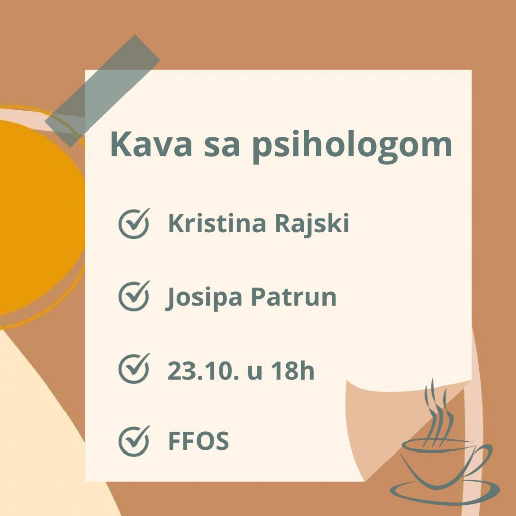 Srdačno vas pozivamo na prvu Kavu sa psihologom u ovoj akademskoj godini koja će se održati u ponedjeljak, 23. 10. 2023., u 18 sati u velikoj svečanoj dvorani (60) na Filozofskom fakultetu u Osijeku.
