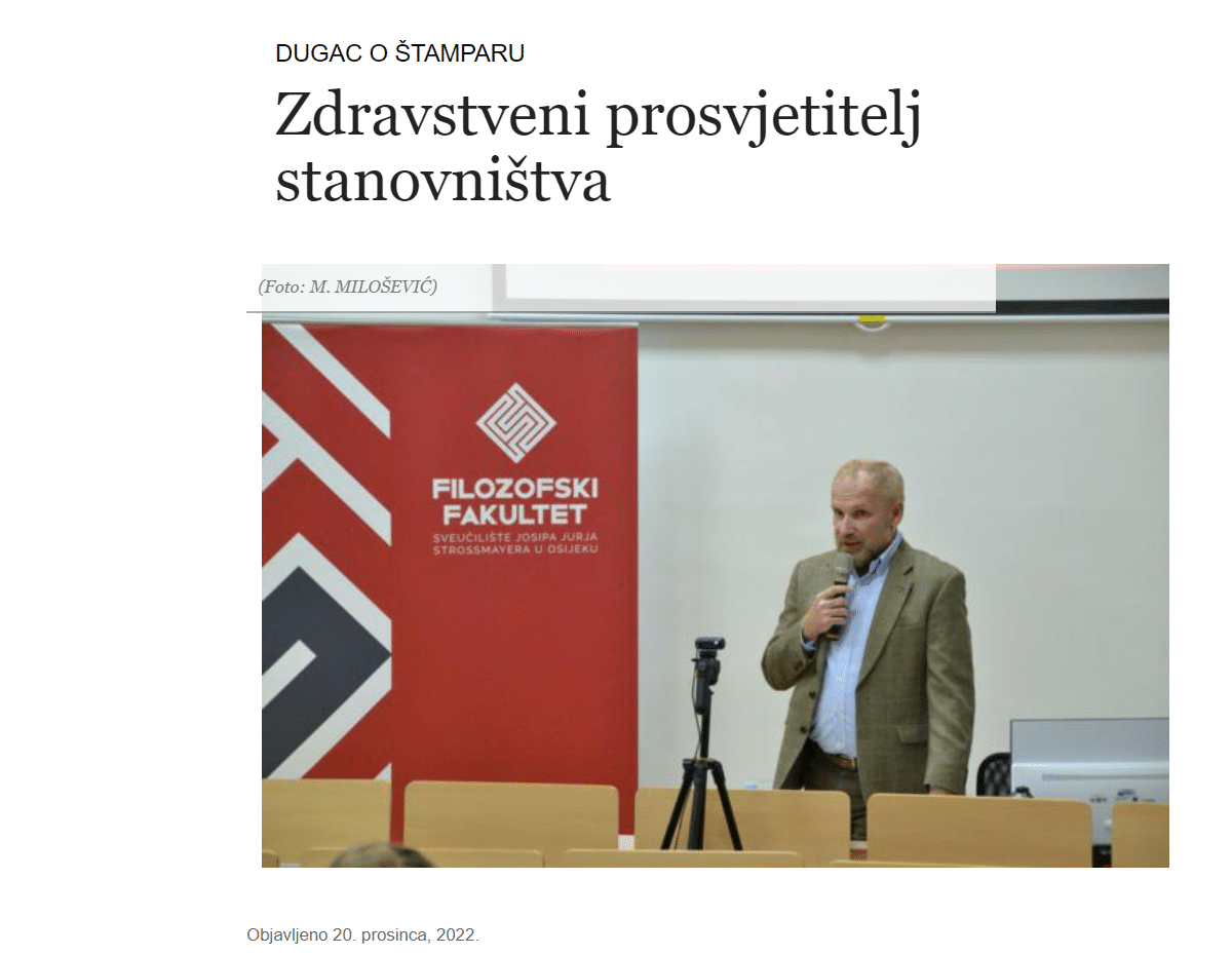 Medijske objave u prosincu 2022. Objavljeno 28. prosinca 2022. | Administrator Prva autorska znanstvena monografija posvećena Juditi FFOS: 16 dana aktivizma 16 dana aktivizma na FFOS-u FFOS: Svečana proslava 180 godina postojanja Matice hrvatske Upriličena svečana proslava 180 godina postojanja Matice hrvatske Predavanje „Andrija Štampar, zdravlje i društvo“ na FFOS-u Zdravstveni prosvjetitelj stanovništva Odakle vjerovanje u teorije urote?