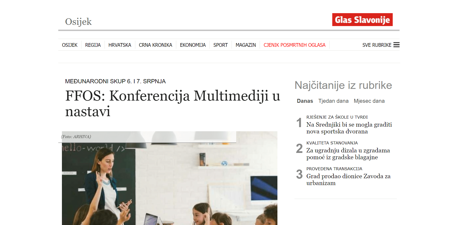 Medijske objave u srpnju 2022. Objavljeno 28. prosinca 2022. | Administrator FFOS: Konferencija Multimediji u nastavi Konferencija “Multimedija u nastavi”