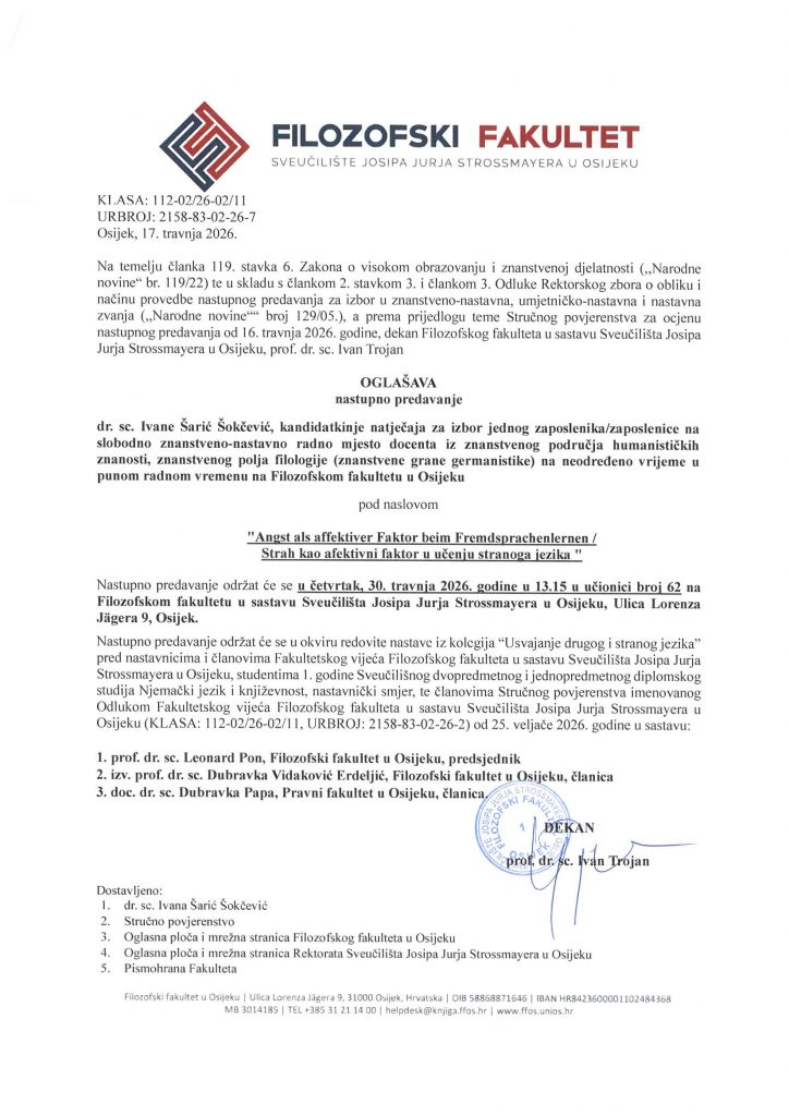 • Obavijest o održavanju nastupnog predavanja – dr. sc. Ivana Šarić Šokčević