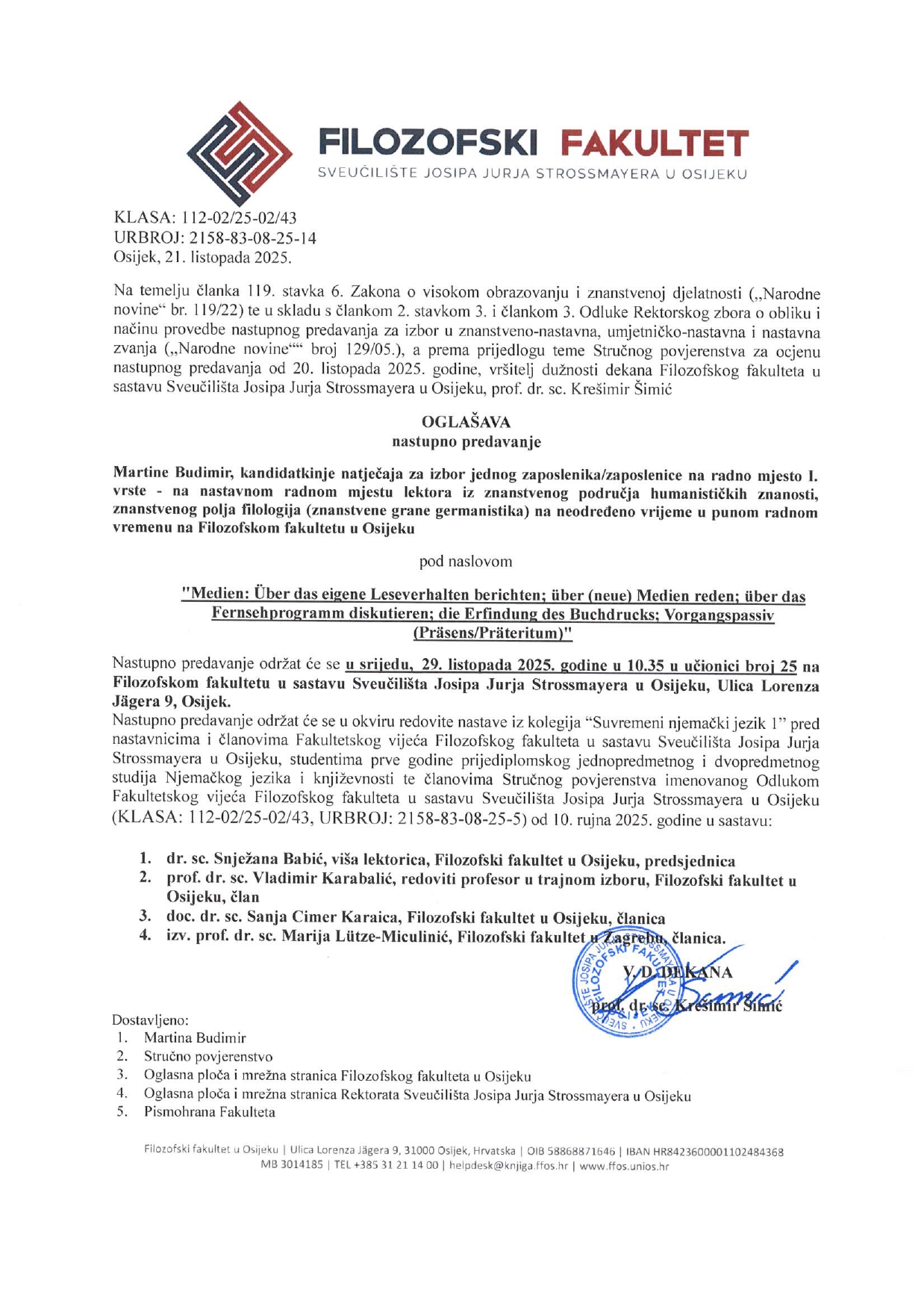 Obavijest o održavanju nastupnog predavanja: Martina Budimir Objavljeno 22. listopada 2025. | Administrator PDF-dokument