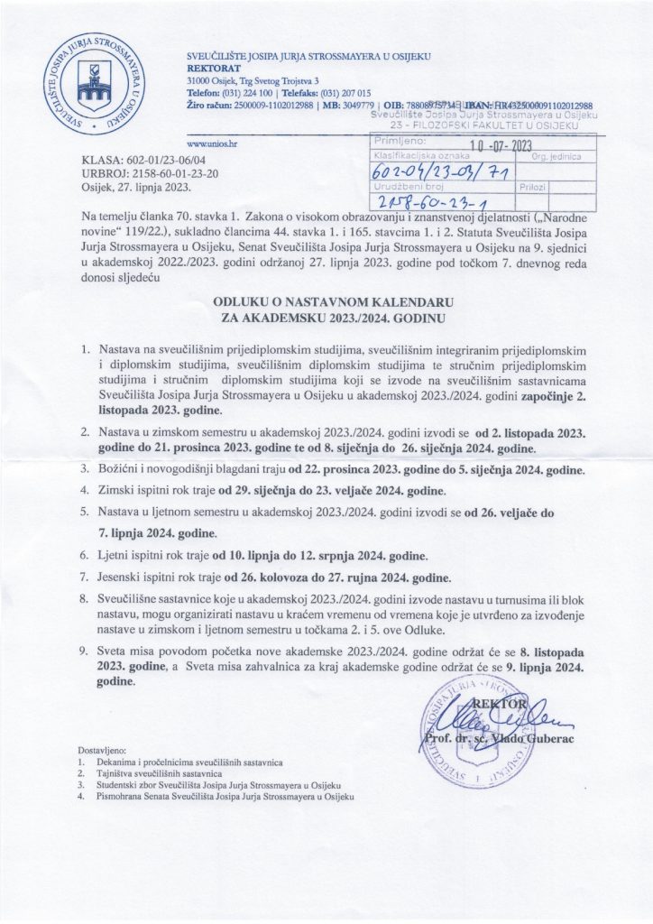 Odluka o nastavnom kalendaru za akademsku 2023./2024. godinu