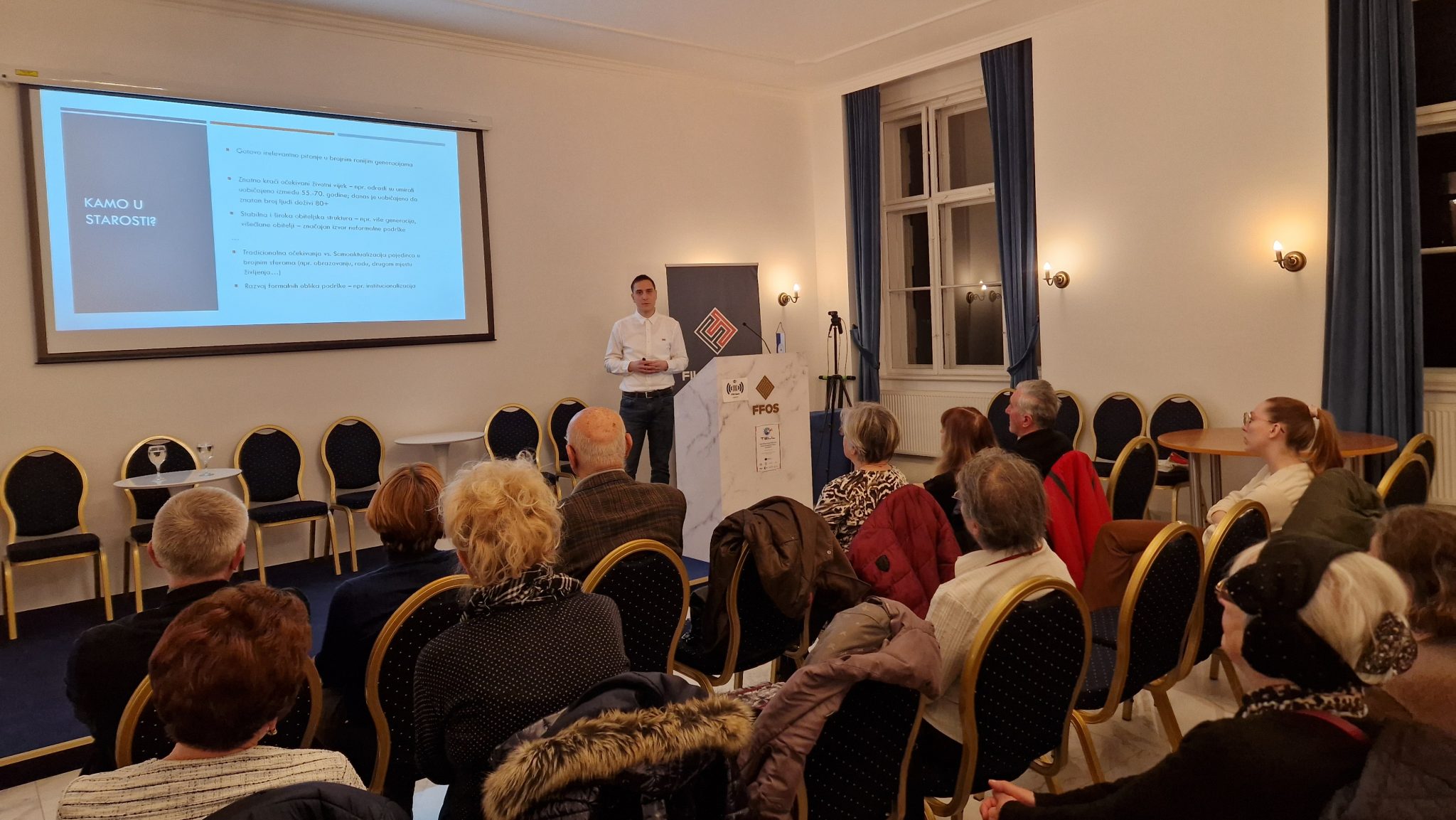 Dr. sc. Petar Šajfar otvorio je izlaganje upravo tim pitanjem, istaknuvši kako ono u ranijim generacijama gotovo da nije postojalo. Kraći životni vijek i stabilna, višegeneracijska obiteljska struktura činili su institucionalnu skrb manje potrebnom. U suvremenim okolnostima, međutim, produženje životnog vijeka i promjene u obiteljskoj dinamici nameću potrebu za sustavnim promišljanjem skrbi. Govoreći o institucionalnoj skrbi, naglasio je da ona može biti korisna ne samo starijim osobama, nego i njihovim obiteljima, zaposlenicima ustanova, lokalnoj zajednici i društvu u cjelini. Ipak, postavio je ključno pitanje: zašto dio starijih osoba ne želi živjeti u domu? U tom je kontekstu istaknuo kako su starije osobe „stručnjaci po iskustvu“, te da se bez njihova aktivnog sudjelovanja ne može kvalitetno procijeniti koje su njihove stvarne potrebe.