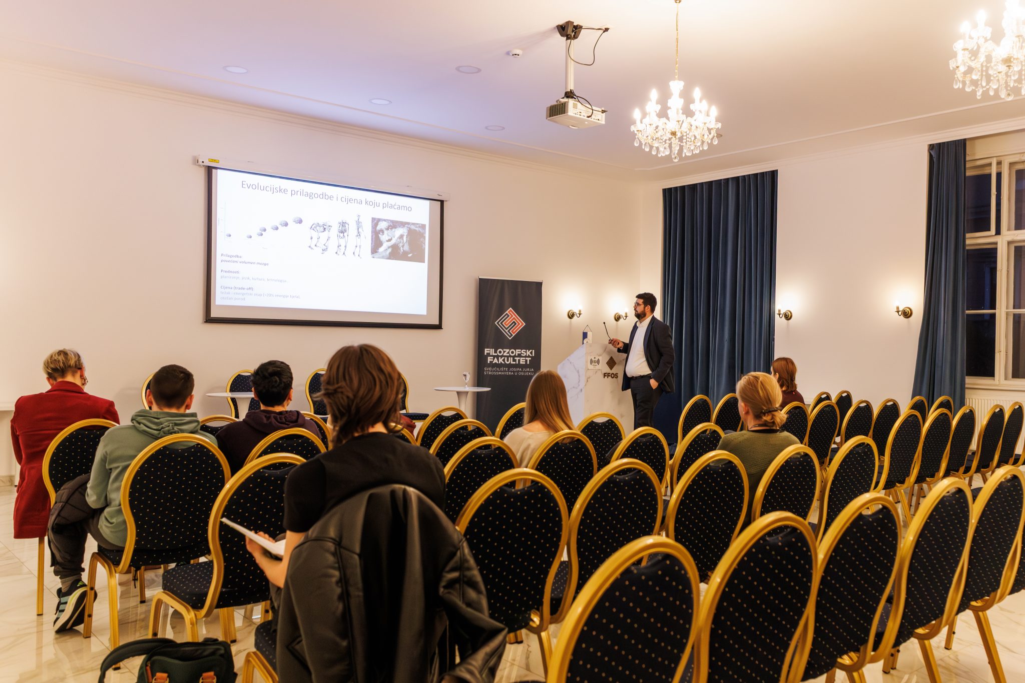 Predavanje se dotaknulo i povijesti razvoja čovjeka kao vrste – od najranijih ljudskih predaka do Homo sapiensa 21. stoljeća – s posebnim naglaskom na migracije ljudske vrste po cijelom svijetu. Te selidbe imale su i medicinske posljedice: različite populacije razvile su posebne genetske osobine, pa različiti narodi, pa čak i kulture, reagiraju potpuno drugačije na neke lijekove. Predavač je objasnio i neka evolucijski zanimljiva “rješenja”. Primjerice, srpasta anemija, koja uzrokuje ozbiljne zdravstvene tegobe, istovremeno štiti od malarije. Stoga u područjima gdje je malarija česta pojava srpasta je anemija i dalje prisutna u populaciji jer donosi određenu zdravstvenu prednost. Osim toga ispostavlja se da smo od neandertalaca, vrste koja je odavno izumrla, naslijedili neke gene koji utječu na to kako naš imunološki sustav reagira na bolesti danas, uključujući koronavirus. Posebnu pozornost publike privukao je dio predavanja o antibioticima i njihovoj pretjeranoj uporabi. Predavač je istaknuo da se antibiotici ne koriste pretjerano samo u medicini, primjerice kada ih liječnici propisuju i za virusne infekcije (kod kojih ionako ne pomažu), nego i u uzgoju stoke s ciljem ubrzanog rasta životinjske mase. Sve to doprinosi otpornosti bakterija na antibiotike, što može u budućnosti ozbiljno ugroziti jedno od najvažnijih medicinskih dostignuća u povijesti. Predavač se na kraju posvetio ljudskoj mikrobioti, zajednici mikroorganizama koji žive u našem tijelu i na njemu. Ti sitni stanovnici našeg tijela sudjeluju u probavi, pomažu u izgradnji imunološkog sustava i štite nas od štetnih bakterija. Poremećaji u mikrobioti mogu biti povezani s alergijama i problemima s metabolizmom, ali mogu dovesti i do razvoja karcinoma, različitih bolesti živčanog sustava i psihičkih smetnji poput depresije.