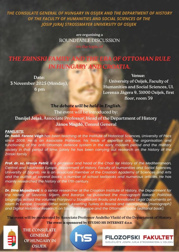 U organizaciji Generalnog konzulata Republike Mađarske u Osijeku i Odsjeka za povijest Filozofskog fakulteta u Osijeku u ponedjeljak 3. studenog 2025. godine održat će se okrugli stol pod naslovom “The Zrinski Family and the Era of Ottoman Rule in Hungary and Croatia”.