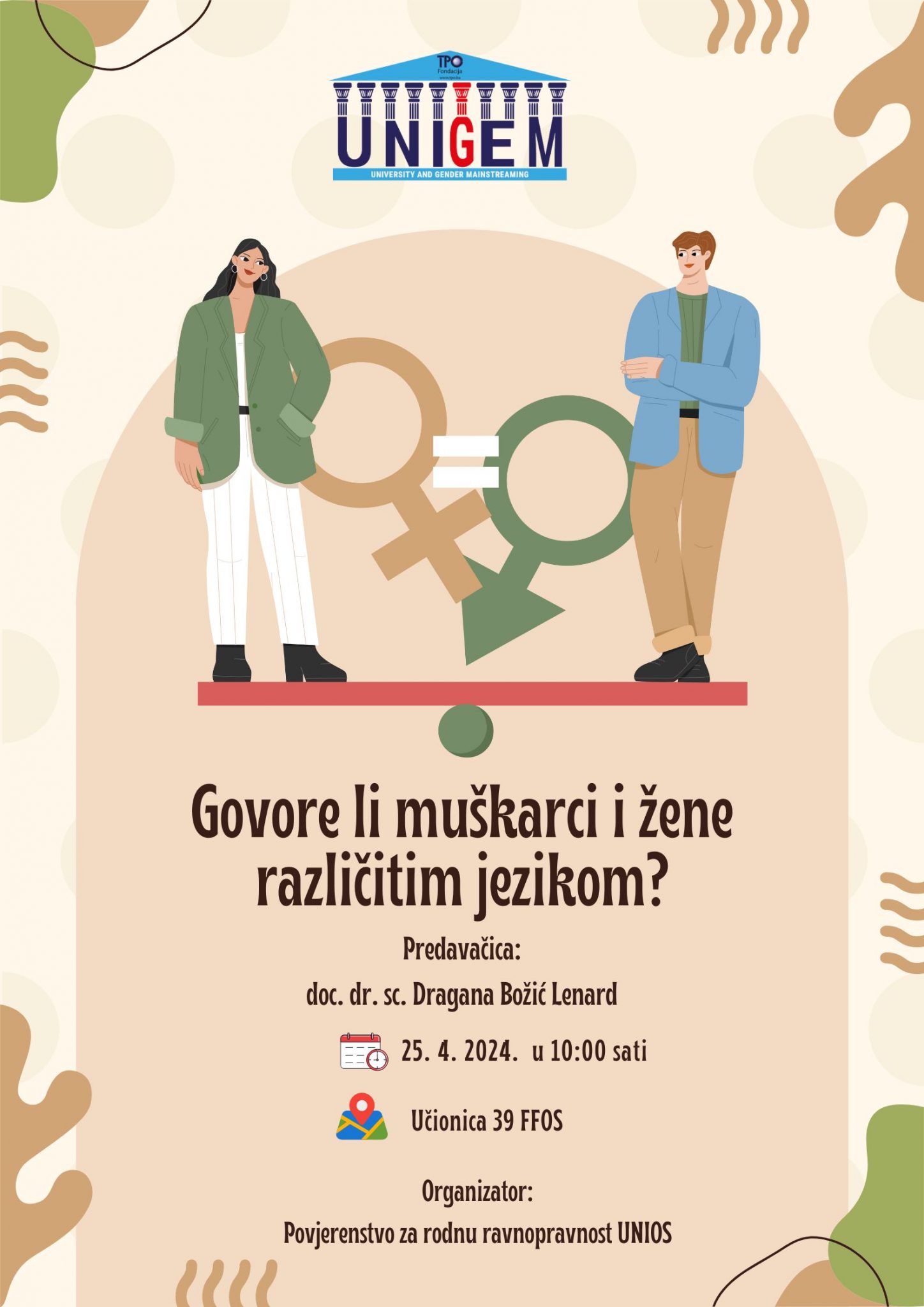 Pozivamo vas u sklopu aktivnosti osječke podružnice HSD-a, projekta UNIGEM i Povjerenstva za rodnu ravnopravnost UNIOS na predavanje doc. dr. sc. Dragane Božić Lenard pod nazivom “Govore li žene i muškarci različitim jezikom?” 25. 4. 2024. u 10 sati na Filozofski fakultet u Osijeku (dvorana 39).