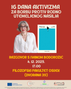 U četvrtak, 4. prosinca 2025. godine s početkom u 17 sati u dvorani 39 Filozofskog fakulteta u Osijeku održat će se razgovor s književnicom Ivanom Bodrožić i predstavljanje knjige pod nazivom “Fikcija”. Književni susret organiziraju Nansen dijalog centar, Gradska i sveučilišna knjižnica Osijek i Filozofski fakultet u Osijeku u okviru kampanje “16 dana aktivizma za borbu protiv rodno utemeljenog nasilja”. Program će moderirati urednica Glasa Slavonije Ivana Rab Guljaš.