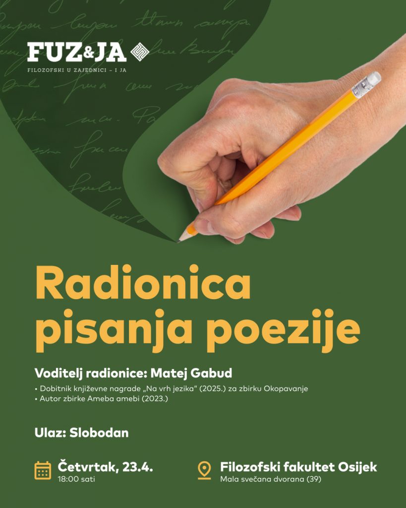 U četvrtak, 23. travnja 2026. u sklopu FUZ&JA-e, projekta popularizacije znanosti Filozofskog fakulteta u Osijeku, student druge godine diplomskoga studija engleskog i hrvatskog jezika i književnosti Matej Gabud održat će radionicu pisanja poezije. Iako u suvremenoj književnosti zauzima rubno mjesto, poezija sadrži neosporivu ljekovitost i služi kao podsjetnik na ljudsku ranjivost i snagu jezika. Pridružite nam se na toj opuštenoj pjesničkoj radionici koja će otvoriti vrata svima koji su spremni zaviriti u sebe. Na radionicu su pozvani i svi oni koji nisu studenti, a zanima ih kreativno izražavanje. Vidimo se u 18 sati u Maloj svečanoj dvorani (39) na Filozofskom fakultetu u Osijeku (Lorenza Jägera 9).