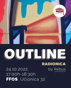 U ponedjeljak, 24. listopada 2022. u 17.00 sati na Filozofskom fakultetu u Osijeku u organizaciji Alumni udruge FFOS i FUZ&JA FFOS održana je radionica Outline, pod vodstvom Vedrana Bjelobradića, osječkog grafitera, umjetničkog imena Rebus. Sudionici radionice imali su priliku istražiti povijest grafita, doznati u kojem se smjeru razvijao taj način umjetničkog izražavanja te uživati u izradi vlastitih skica. Popraćeno slikovnim prikazom grafita iz cijeloga svijeta, voditelj radionice predstavio je osnove grafita od samih početaka njihova pojavljivanja, od kraja 60-ih godina sve do danas, a djelić atmosfere možete vidjeti na fotografijama i u videu https://www.youtube.com/watch?v=BsHnkaHSvRg