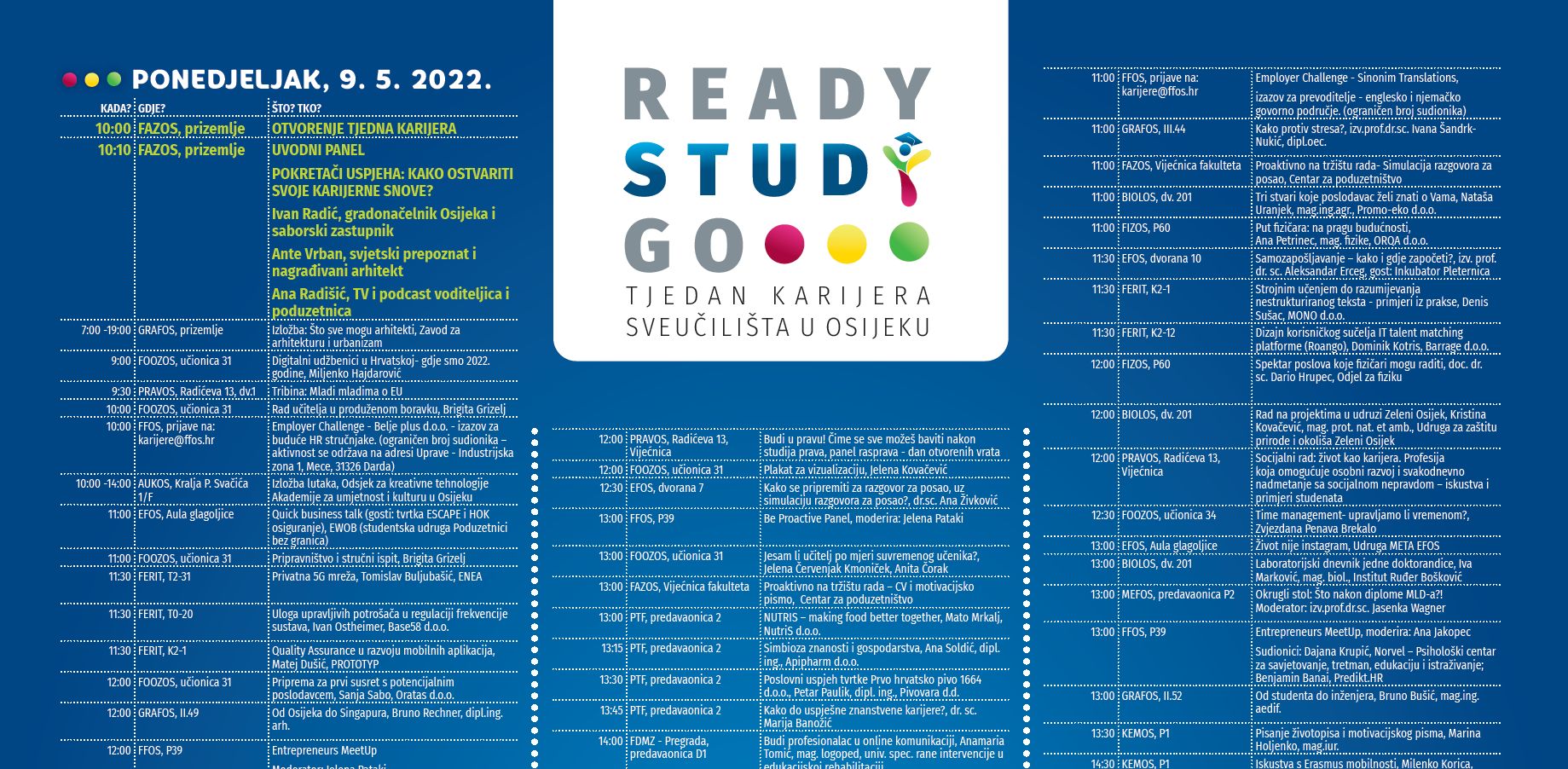 Sveučilište u Osijeku u razdoblju 9.-13. svibnja 2022. organizira Tjedan karijera Sveučilišta u Osijeku s ciljem razvoja karijere naših studenata, ali i njihovog povezivanja s poslovnim sektorom. Tjedan će obuhvatiti niz aktivnosti, radionica, okruglih stolova, tribina, predavanja namijenjenih studentima i speed dating, u suorganizaciji svih znanstveno-nastavnih i umjetničko-nastavne sastavnice našega Sveučilišta.