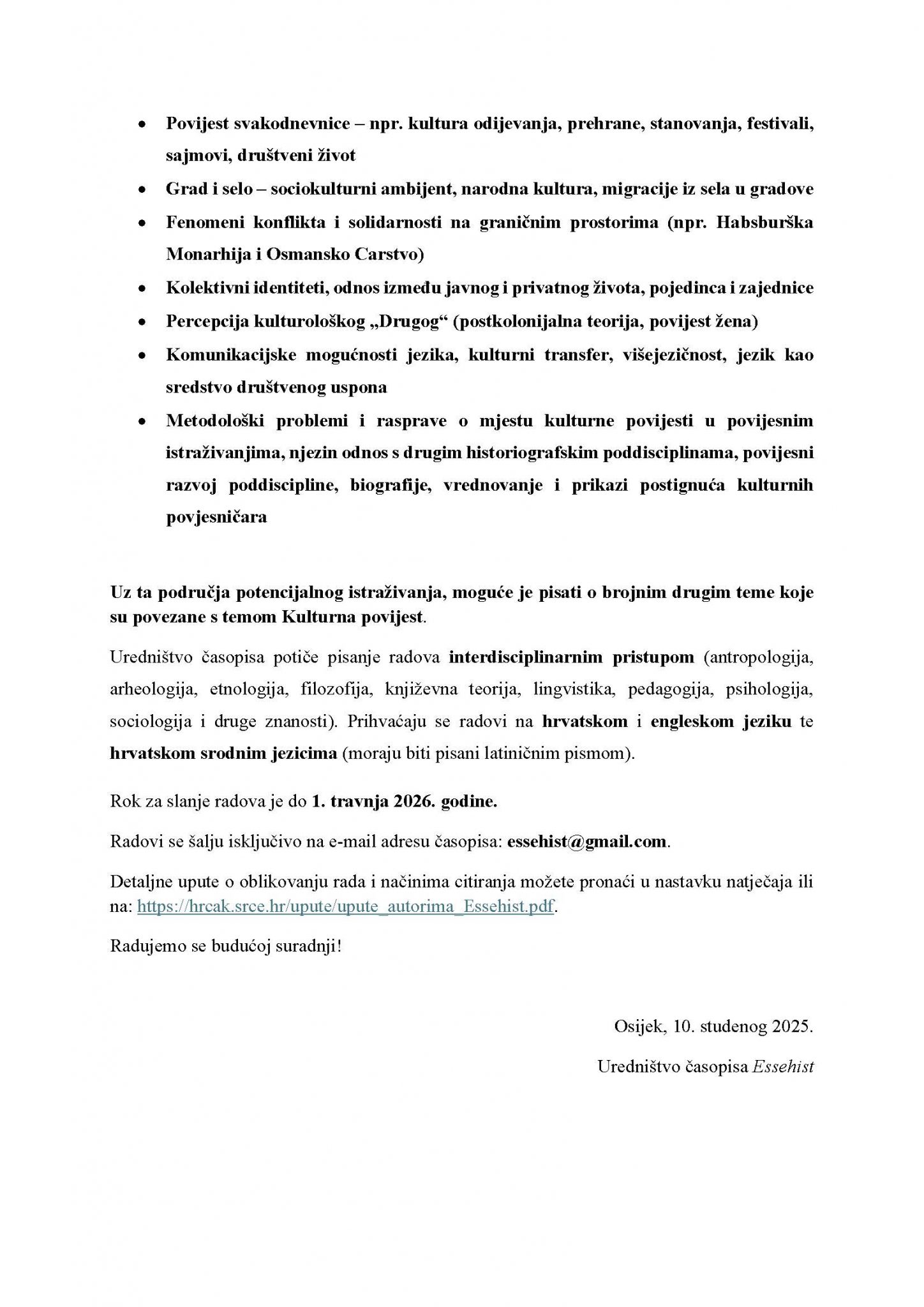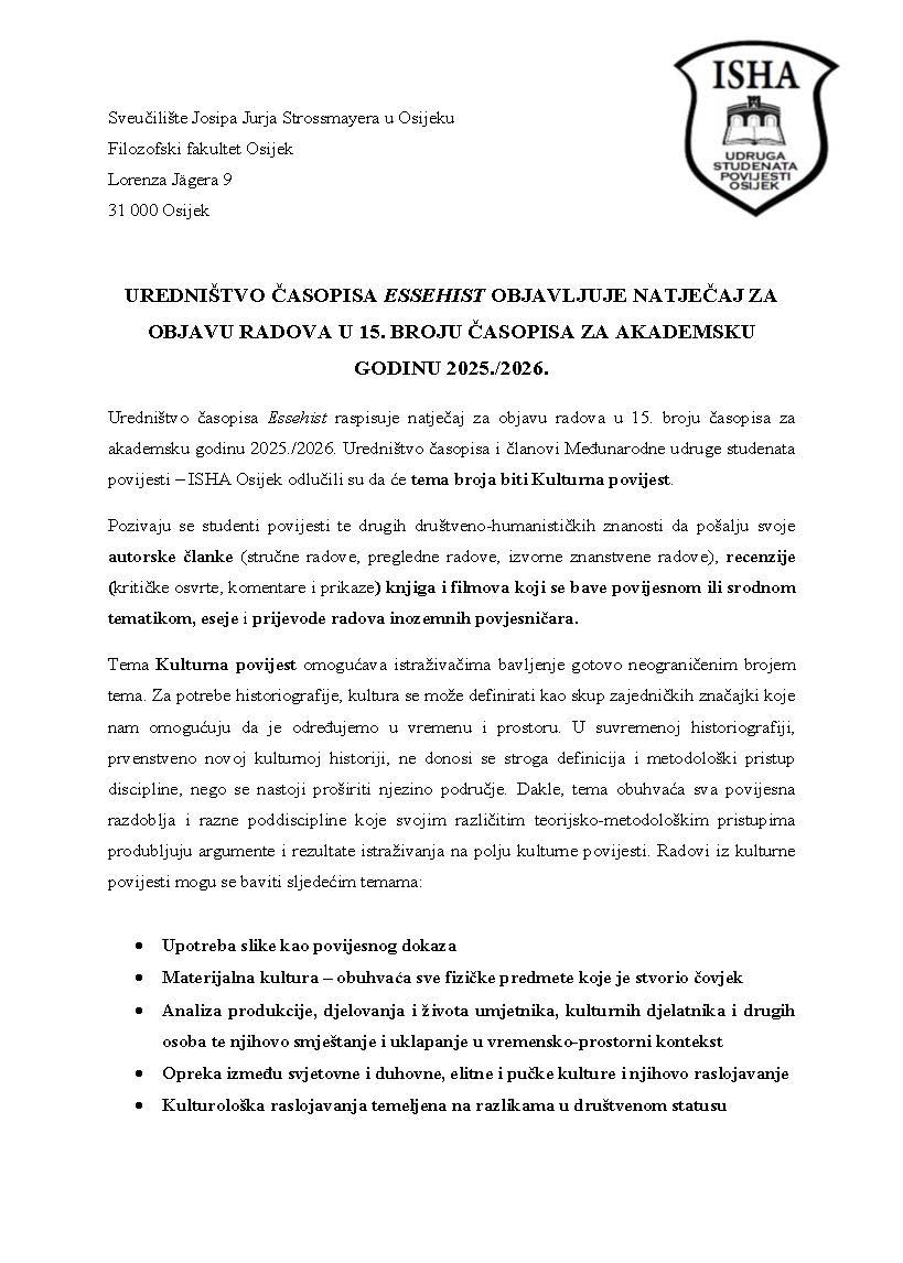 Uredništvo časopisa Essehist raspisuje natječaj za objavu radova u 15. broju časopisa za akademsku godinu 2025./2026. Uredništvo časopisa i članovi Međunarodne udruge studenata povijesti – ISHA Osijek odlučili su da će tema broja biti Kulturna povijest.