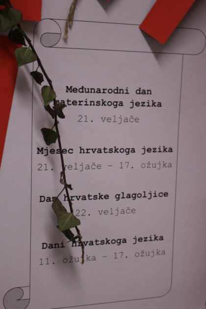 Mjesec hrvatskoga jezika započinje Međunarodnim danom materinskoga jezika koji se obilježava 21. veljače. Odluku o obilježavanju Međunarodnoga dana materinskoga jezika donio je UNESCO 1999. godine na 30. zasjedanju Glavne skupštine s ciljem promicanja jezične raznolikosti i višejezičnoga obrazovanja te kako bi podsjetio da su jezici temeljne sastavnice civilizacijskoga kulturnog naslijeđa, prostor i izraz ljudske kreativnosti i različitosti koju treba slaviti.