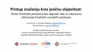 Na izlaganju je predstavljen Portal hrvatskih poslovica nastao pri Centru. Predstavljena je metodologija predmetne i jezične obrade poslovica te implikacije za daljnji razvoj Portala. Naposljetku se povela rasprava o njegovoj korisnosti i primjenjivostiu znanstvenoj, ali i široj društvenoj zajednici.
