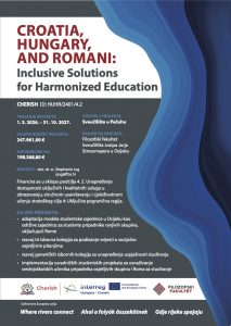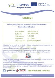 Projekt Croatia, Hungary, and Romani: Inclusive Solutions for Harmonized Education vodi se pod akronimom CHERISH i identifikacijskim brojem HUHR/2401/4.2/087. Sufinanciran je sredstvima EU u sklopu Prvog poziva Interreg VI-A Hungary-Croatia Programme 2021-2027 kroz prioritet P4 – Inclusive border region i specifični cilj: 4.2. Improving access to inclusive and quality services in education, training and lifelong learning
