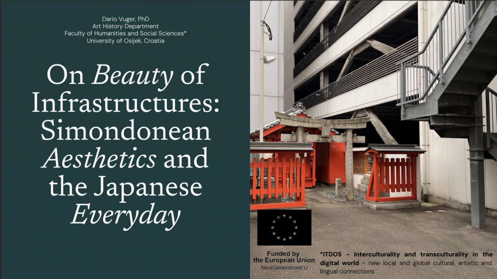 U sklopu projektnih aktivnosti ITDOS projekta, Dario Vuger održao je javnu prezentaciju u sklopu međunarodnog znanstvenog skupa 10th Vienna Forum for Intercultural Philosophy: Everyday Aesthetics and Everydayness from an Intercultural Perspective koji se održao u Centru Otto Mauer, Währingerstraße 2-4, Beč u razdoblju od 27. veljače do 1. ožujka 2026. godine. Izlaganje sa raspravom pod naslovom “On Beauty of Infrastructures: Simondonean Aesthetics and the Japanese Everyday” održano je prvog dana skupa, 27. veljače. Program skupa i sažetke izlaganja možete preuzeti i pročitati u pdf formatu putem ovog linka.