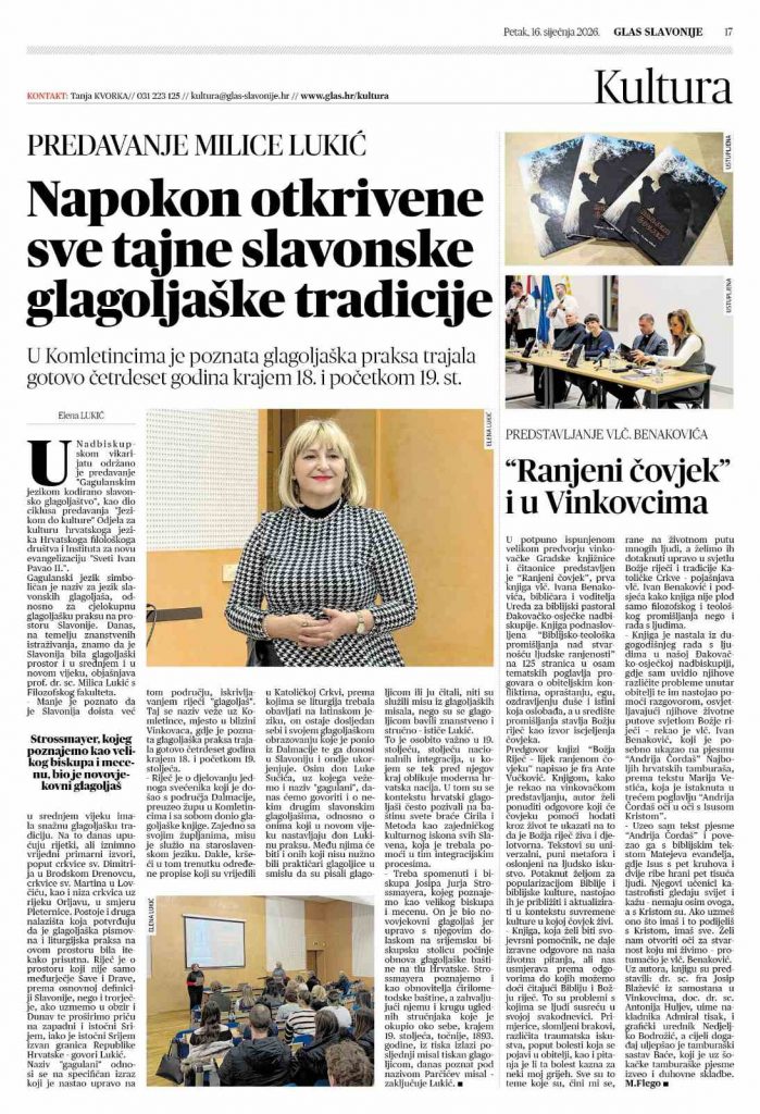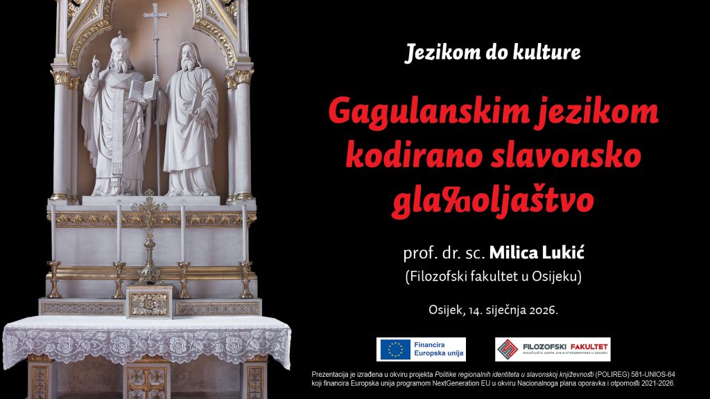 Prof. dr. sc. Milica Lukić održala je 14. siječnja 2026. u Nadbiskupskom vikarijatu Osijek znanstveno-popularno predavanje pod nazivom „Gagulanskim jezikom kodirano slavonsko glagoljaštvo“. Predavanje je održano u okviru ciklusa predavanja Jezikom do kulture, a u organizaciji Odjela za kulturu hrvatskoga jezika Hrvatskoga filološkog društva i Instituta za novu evangelizaciju „Sv. Ivan Pavao II.“.