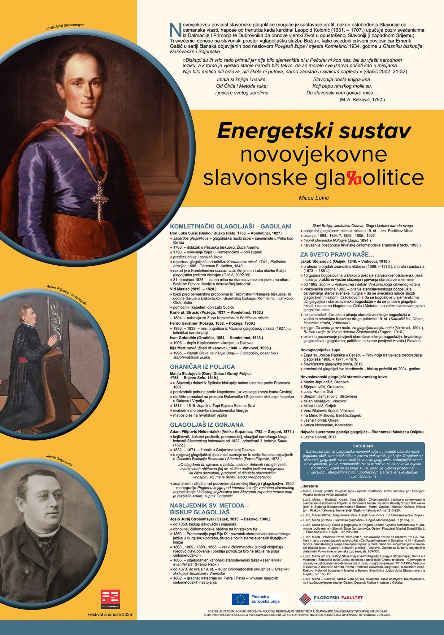 Milica Lukić izradila je plakat pod naslovom Energetski sustav novovjekovne slavonske glagolitice, na kojem je predstavila rad svećenika koji su u razdoblju od kraja 18. do 20. stoljeća donosili „na slavonski prostor »glagoljašku službu Božju«”. Posebno je istaknula široku kulturnu ulogu svećenstva koje je, osim oživljavanjem staroslavenske liturgije, svojim znanstvenim i nastavničkim radom te kulturnim pokroviteljstvom i poticanjem tiskanja glagoljskih izdanja skrbilo o hrvatskoj glagoljaškoj baštini (don Luka Sučić, Matija Sladojević, Adam Filipović Heldentalski, Josip Juraj Strossmayer, Jakob Stojanović i mnogi drugi).